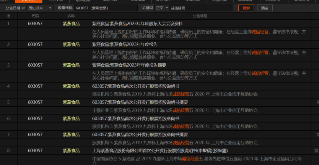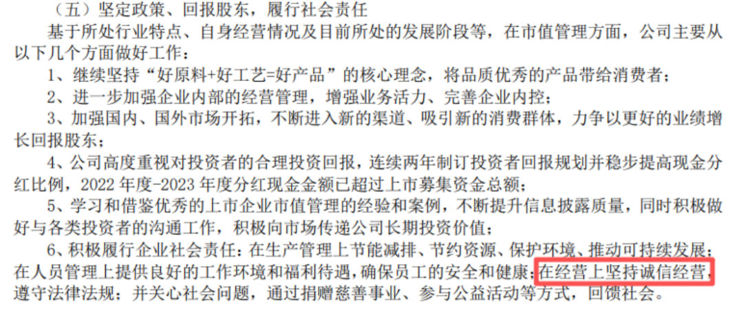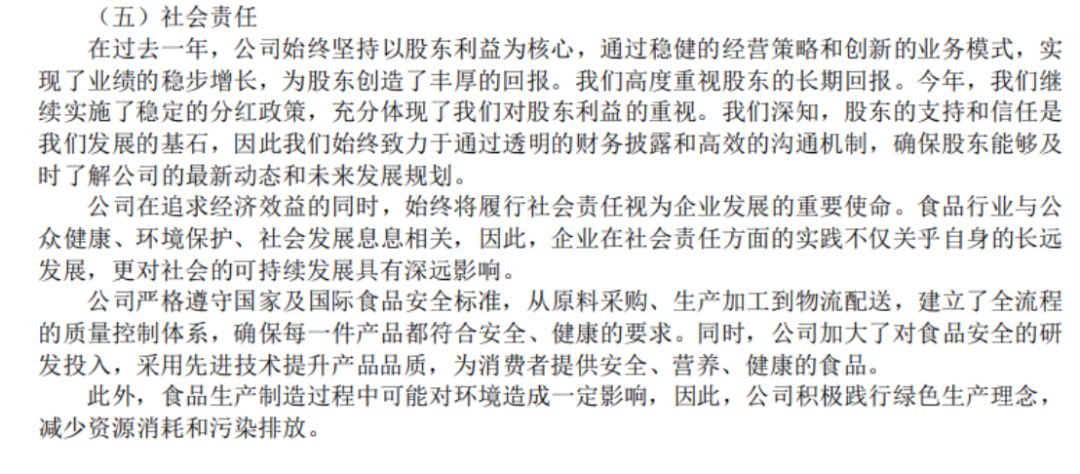 不仅如此,资料显示,紫燕食品是在2022年9月上市,上市前,紫燕食品在招股书中多次将获得“诚信经营”的奖项来宣传自己,上市后“诚信经营”出现的次数越来越少。在2023年的年报中,紫燕食品还表示“在经营上坚持诚信经营,遵守法律法规”,然而,从之后的公告中,凤凰网财经《公司研究院》再未发现“诚信经营”四个字,在社会责任一项,更多的表述是“以股东利益为核心。”