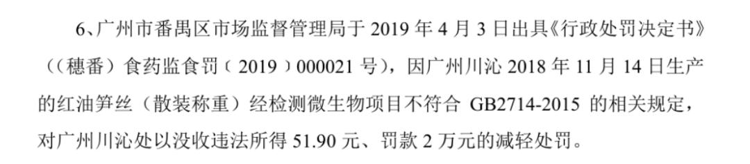 2019年4月,紫燕百味鸡散称的红油笋丝微生物项目不合格,被广州市番禺区市场监督管理局没收违法所得 51.9元,还罚了2万元。