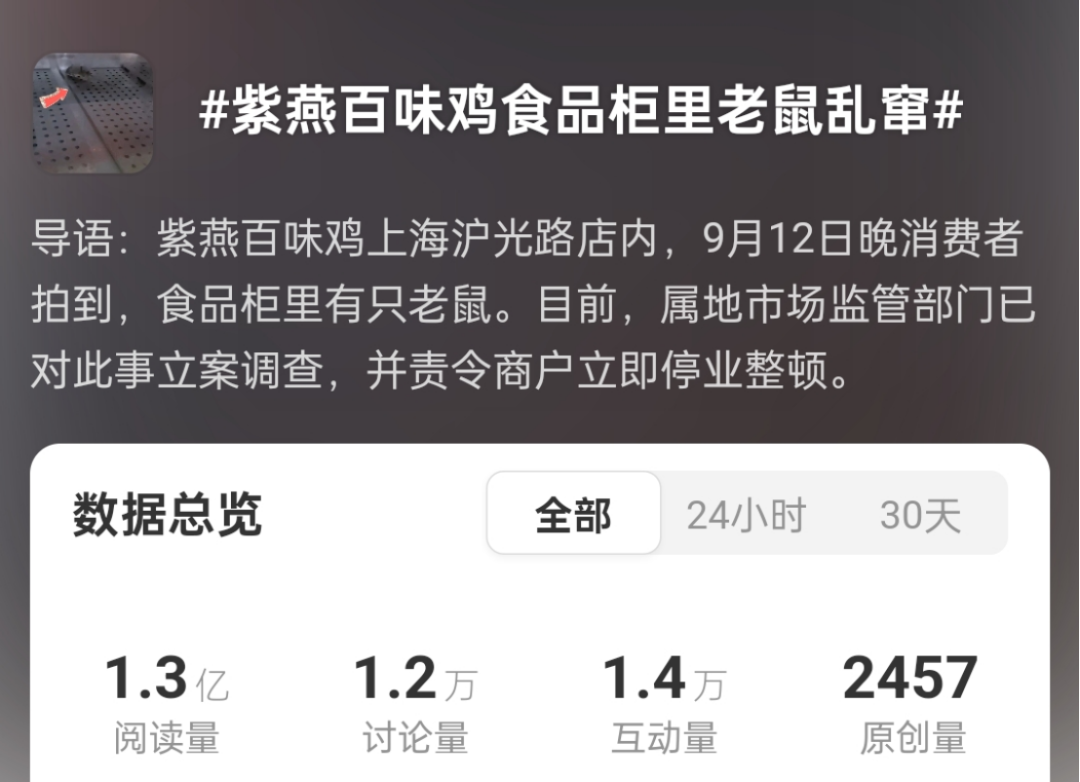更早的2021年,“紫燕百味鸡食品柜里老鼠乱窜”的话题还登上过热搜,有消费者在上海沪光路的紫燕百味鸡门店里,拍到食品柜里有老鼠出没。