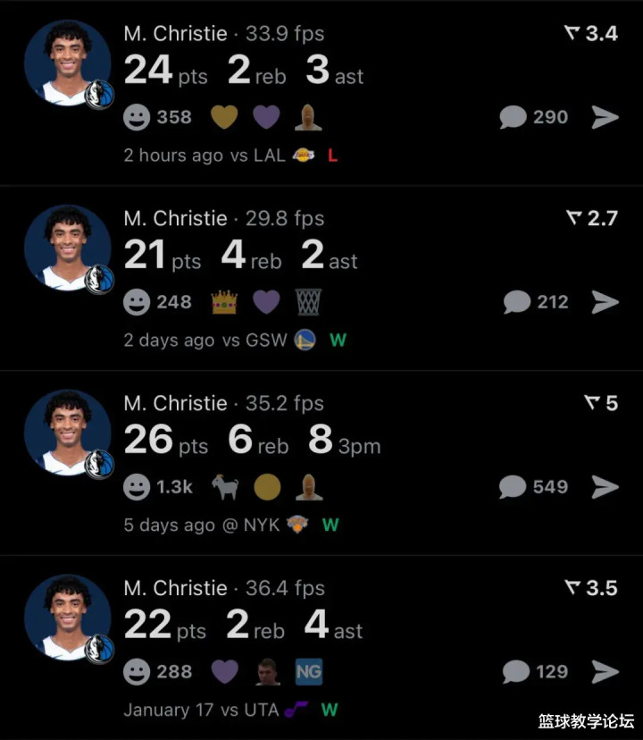 独行侠球员马克斯-克里斯蒂连续四场砍下20+,这四场比赛他场均23.3分3.5篮板2.8助攻,投篮命中率51.7%,三分命中率52.6%,罚球命中率91.7%。克里斯蒂四场一共投进20记三分,场均能命中5记,外线火力凶猛。